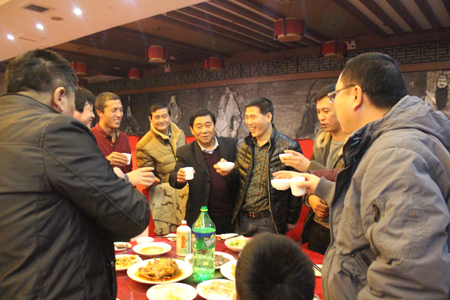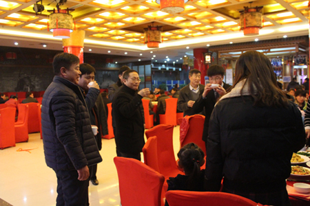 晚會結(jié)束后,春節(jié)晚宴開始。董事長李成彬、總經(jīng)理劉迎波與公司領(lǐng)導(dǎo)來到員工中間,向員工敬酒,祝賀新年。